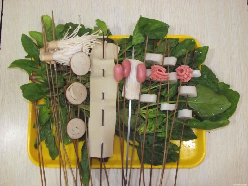 串羊肉、串鸡脯、火腿肠、串肥肠、串肚片、串猪血、串鸡血、串鸡心、串肉丸、香肠 串鸭胗、串鱼肠、串鱼泡、串鱼丸、串海带、串鱿鱼、串墨鱼、串青虾、鹌鹑蛋、串豆腐、串蘑菇、串菠菜、串千张、串白菜、串生菜、金针菇、串干子、串藕片、串茄片、