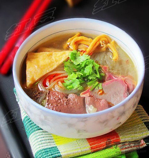 鸭血粉丝汤是南京和镇江著名的风味小吃,由鸭血、鸭肠、鸭肝等加入鸭汤和粉丝制成。口感鲜香,爽口宜人。鸭肉蛋白质含量高,脂肪含量低,特别适合老年人食用。