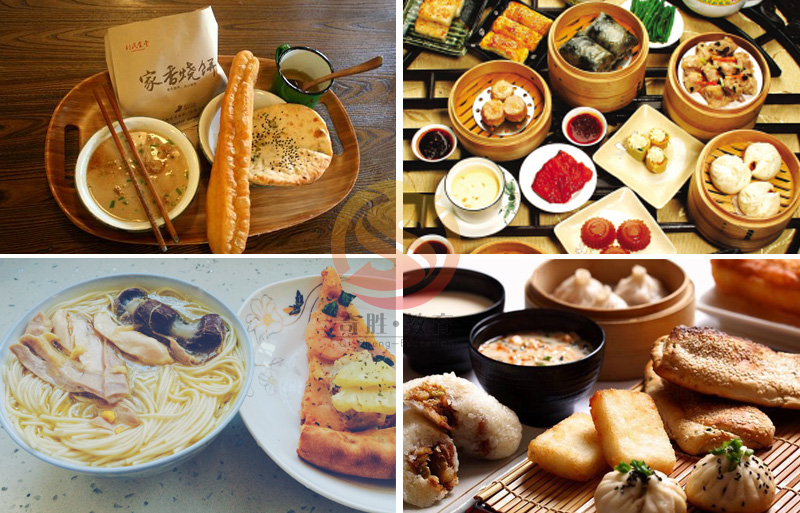 中式早餐标准配置:豆浆、油条、馄饨、包子、煎饼(北方);河粉、烧麦(南方)。