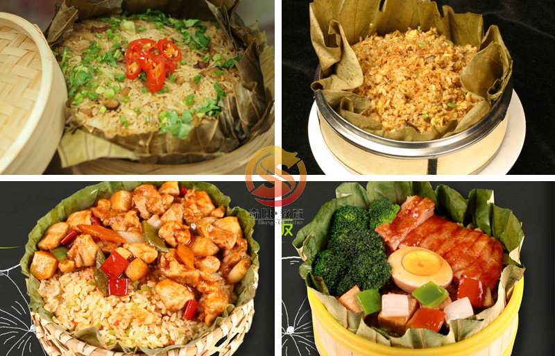 蒸笼饭、钵仔饭:冬菇滑鸡饭、黄鳝田鸡饭、腊肉腊肠饭、榨菜牛肉饭、原味荷叶饭、四宝荷叶蒸饭、牛柳拼荷包蛋饭、腊肉拼排骨饭、叉烧拼蛋角饭、烧鹅拼叉烧饭、咸鱼肉饼拼荷包蛋饭、木耳滑鸡饭、以及各式荷叶饭。赠送:靓汤制作(两款)