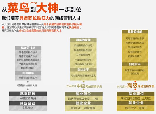 兴元设计网络营销课程由一群潜心于新媒体研究多年的资深人士共同投资创办,在APP应用推广、网络活动策划、微博营销、病毒营销、事件炒作、网络公关、电子商务、品牌战略、广告传播、搜索引擎营销、危机管理等方面具有丰富的策划与项目执行经验。以“实战策划,卓越执行”为理念,通过专业、完整、高质、快捷的品牌维护服务,帮助客户提高知名度、增强美誉度、维护忠诚度,为客户提供专业服务。从网络营销策划到媒体传播,帮助客户一步一步取得竞争优势和商业成功,实现企业的持久发展。
