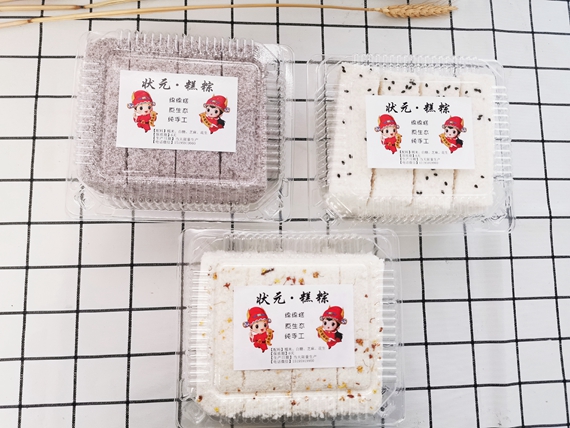 7. 倒扣到砧板货盘子上,切成小块,在椰蓉里裹一圈即可食用