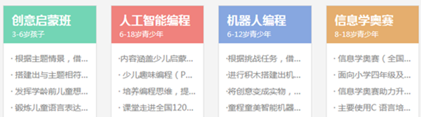 | 智能机器人编程 | 年龄6-18岁,小学1-6年级、初中1-3年级、高中1-3年级的学生 |