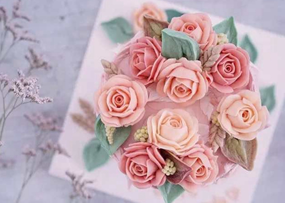 奶油霜韩式裱花,有一个重点就是调色,其中的黄油建议用白色黄油,不要用普通的动物黄油,颜色偏黄色,再加入色素调出来的颜色就不正,暗淡无光泽,十分影响整体效果。