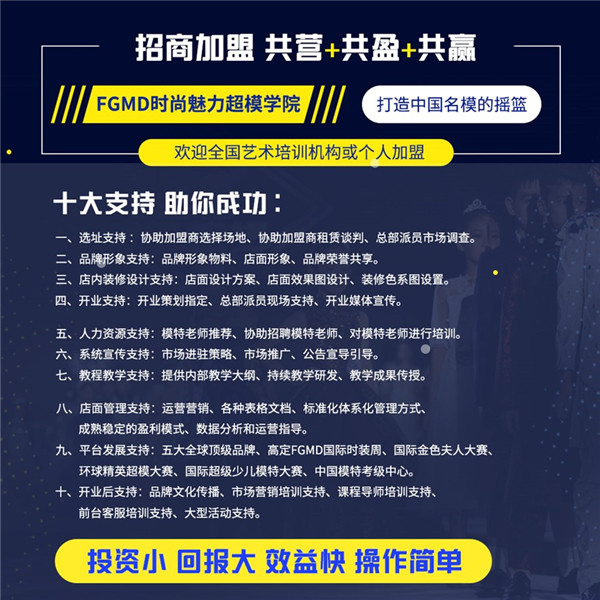 FGMD时尚魅力超模学院是一家从事于模特培训、大赛、考级、时装周、少儿春晚、服装节、影视演艺、经纪、包装推广等高端标准化模特连锁机构。
