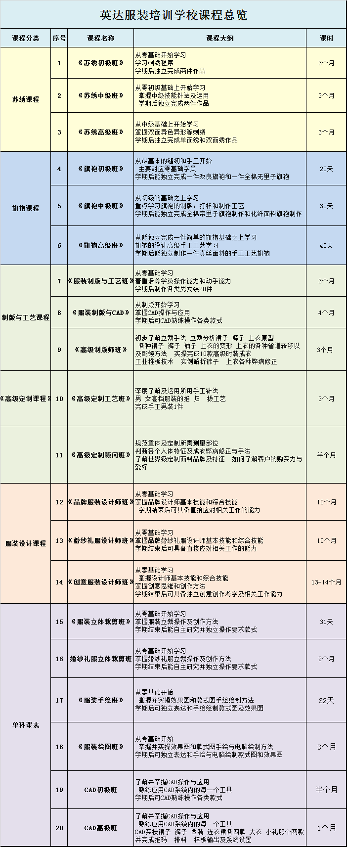 以上内容是关于苏州英达服装技术学校的有关介绍,如果你对苏州苏绣培训,旗袍设计培训,制版与工艺,服装设计,唐装设计培训,服装CAD制版,婚纱礼服设计,汉服设计等培训感兴趣,电话联系我们,了解精彩文章资讯可以关注职业培训栏目,您也可以在线咨询客服。