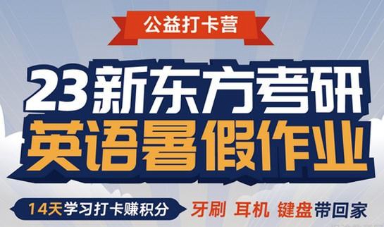 新东方公益打卡营上线,23考研英语暑假作业,三大福利,助你备考,14天免费学,全面提升自己。23考研党专属暑假作业本,学员可选纸质版/电子版,14Days天天练,抢跑搞定英语考研技巧,还有2023考研备考流程,1-12月清晰规划备考内容。