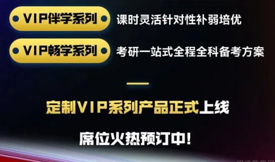 天津新东方考研VIP系列课程火爆上线!此次课程分为课时灵活针对性补弱培优的VIP伴学系列和考研一站式全程全科备考方案的VIP畅学系列,目前课程席位可预约,欢迎广大学员抢购。具体的课程配置如下: