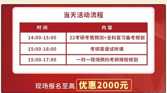 南京新东方考研为大家准备了22考研考情预测:暨全利复习备考规划盛典。帮你用1小时节省1个月的备考时间。具体时间安排如下:14:00-15:00:22考研考情预测+全科复习备考规划;15:00-16:00:考研英语试听课;15:00-17:00:一对一现场预约考研择校规划。现场报名至高优惠2000元!现场还有好礼相送哦~还在等什么,南京新东方考研在这里等你哦!