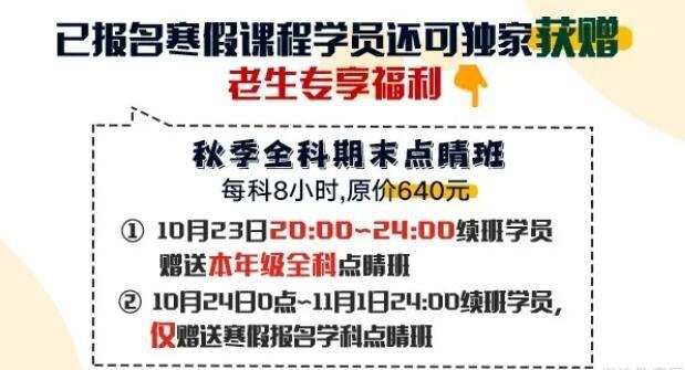 2024年10月23日20:00~24:00续班学员,报名任意学科寒假班即赠送本年级全科期末点睛班。