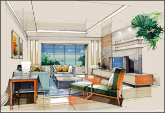 5、技法:一点透视、两点透视,彩铅、马克笔。主要解决设计师的创意理念的表达和沟通。 -