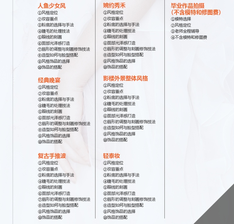 1、让学员熟练掌握影视化妆全流程技能,包括基础妆容、发型设计、美甲设计和饰品制作等。