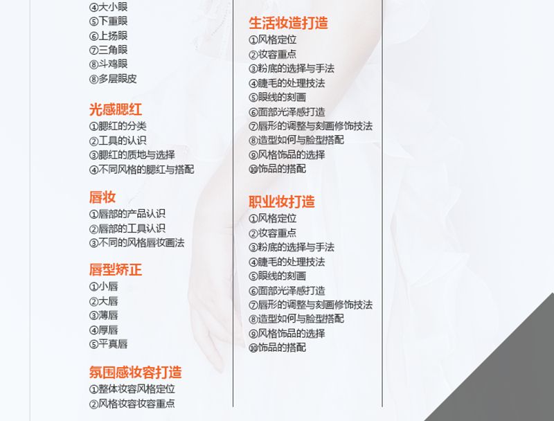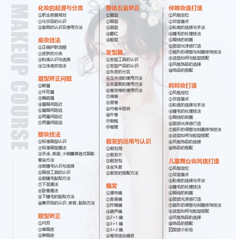 美学观点的掌握及解析;对彩妆进行深层次剖析,使学员能够独立完成彩妆设计与制作;通过系统知识的学习,使学员具备审美、创新、制作设计的能力。