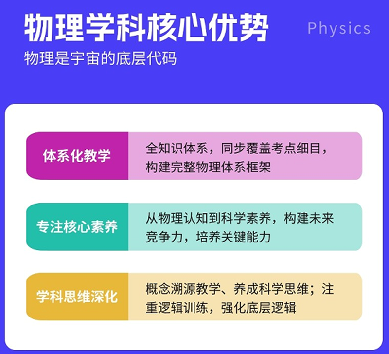 高二:高二下物理只用一个学期,将高二下和高三的知识全部学完,因此,高二物理学习压力大,任务重,本课程注重能力的提升,在巩固原有物理基础之上,注重物理思维的培养,教授学员对于物理题型解题技巧的运用。