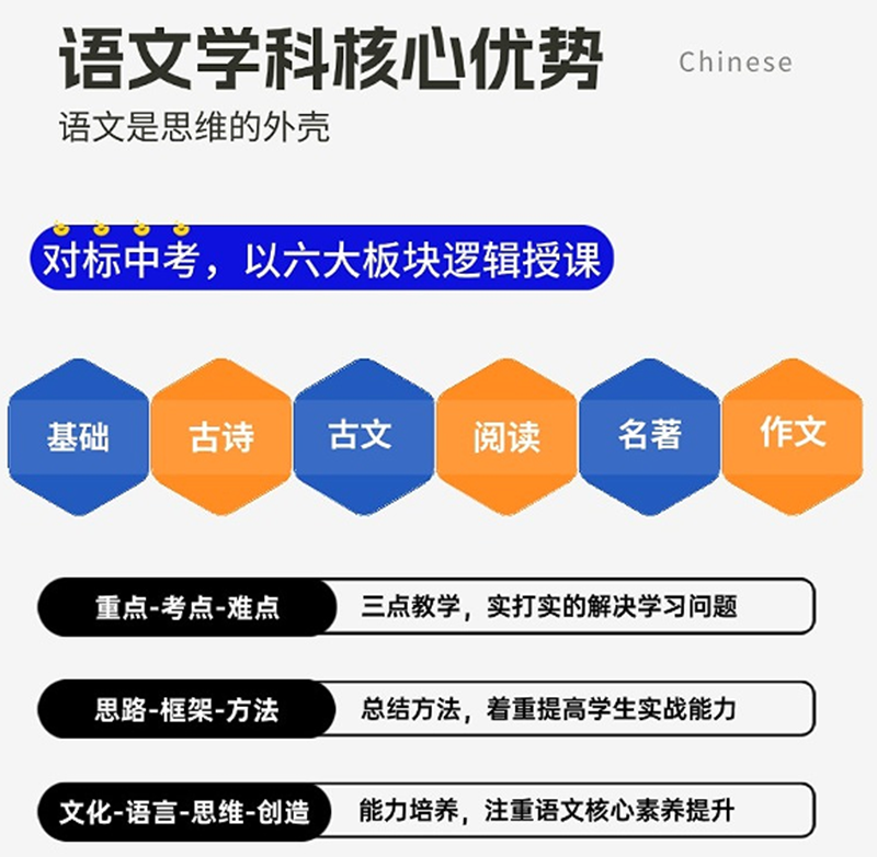初二语文:针对考试大纲为学员们总结初一、初二阶段所有的重难点知识,并且结合一定的习题训练让学员反复巩固这些知识点,归纳语文答题的小技巧,为之后初三的总复习打好坚实的基础;